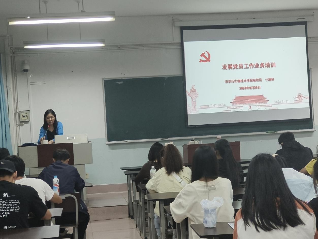 为培养高素质的党务工作人员队伍,进一步提高学院发展党员工作质量,学院党委于2024年9月26日在尚农楼3-15教室召开了发展党员工作业务培训会,由学院党委组织员寸湘琴对学生支委、培养联系人、入党介绍人、党建先锋队员等进行了业务培训。