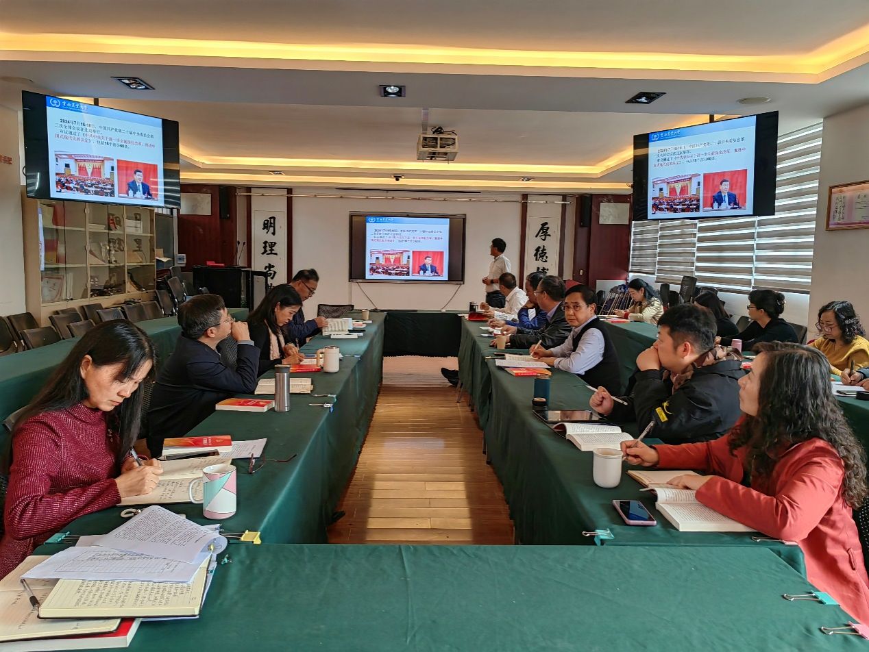 党委理论学习中心组(扩大)以“深入学习贯彻党的二十届三中全会精神和全国教育大会精神 加强铸牢中华民族共同体意识 加快推进学院高质量发展”为主题开展第七次集体学习。校党委副书记黄鹤平到会指导,学院党委委员、领导班子、党支书记和部门负责人参加了学习。