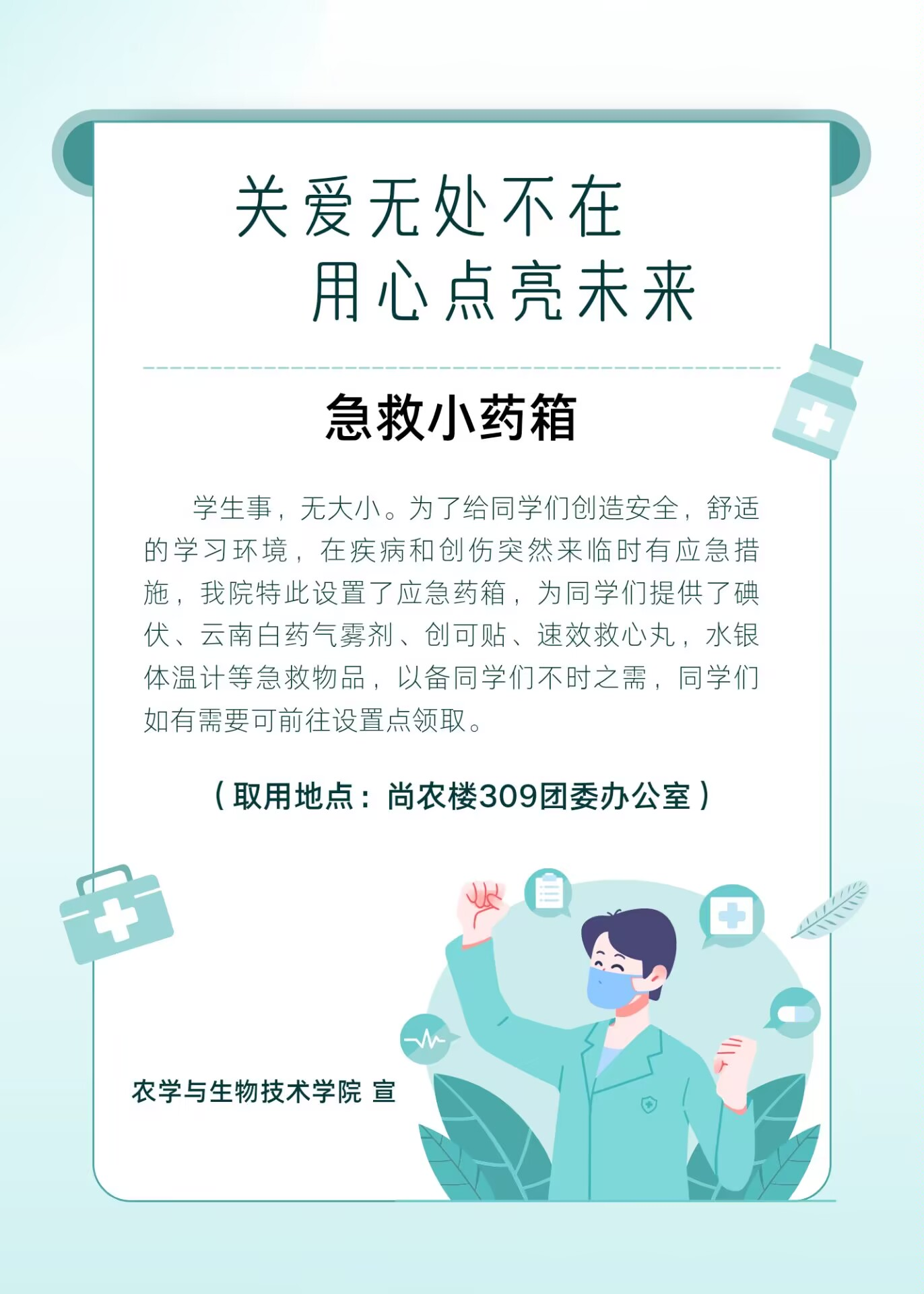 为了给尚农楼上课同学们创造安全,舒适的学习环境,在疾病和创伤突然来临时有应急措施,卡通a片 在院团委办公室(尚农楼309)特意设置了应急药箱,为同学们提供碘伏、云南白药气雾剂 、创可贴、速效救心丸、水银体温计等急救物品。