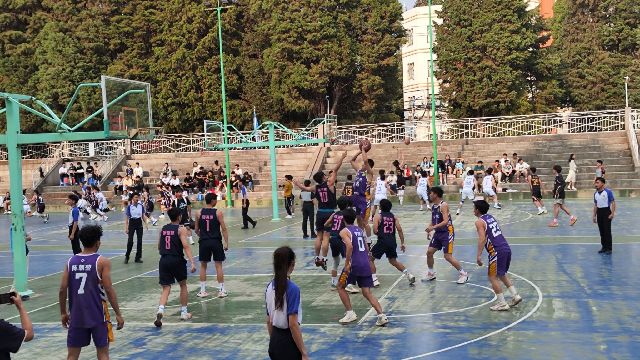 师生为运动员加油助威,观众们的加油声和助威声不断,形成了紧张而激动的氛围。观赛的师生们在助威声中感受到了青春的活力!