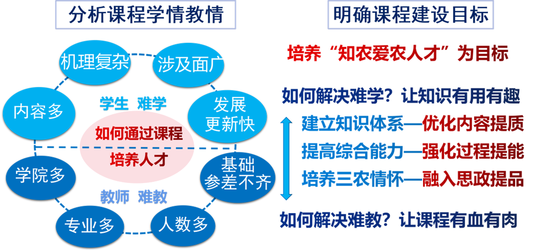 团队及课程负责人字淑慧教授,以共享PPT形式,给大家介绍了“加强课程分析明确教学目标、融入思政优化教学内容、强化课程育人提高课堂教学质量”方法和做法,让难学难教的生化课程,变得“有用有趣、有血有肉”,有效解决了“学生谈课色变、教师授课艰难”难题。团队教师们就分享内容及在教学中遇到的“课程思政难、集体备课难、过程式测试不合格学生辅导难”问题开展了讨论,教师们纷纷发言,认为“课程思政融入是教师不断学习和狠抓落实的问题,应多从国家政策、学校发展和定位、身边人物和故事、案例讲解、分享前沿文献、服务“三农”的科学家及科技人员等内容挖掘思政元素,落实在日常教学中,才能凸显思政融入的目的;教研活动应多开讨论会、多分享资源、多方学习和交流,形成良好氛围,体现集体智慧和备课优势,才能更好的教书育人;对待测试不及格学生,应多了解学生学习、生活、心理等问题,及时与班主任、辅导员和学业导师沟通,通过以爱授课、以爱育人的方式,让学生从心底接受教师和课程,点燃学习热情和激情,提高学习能力”。